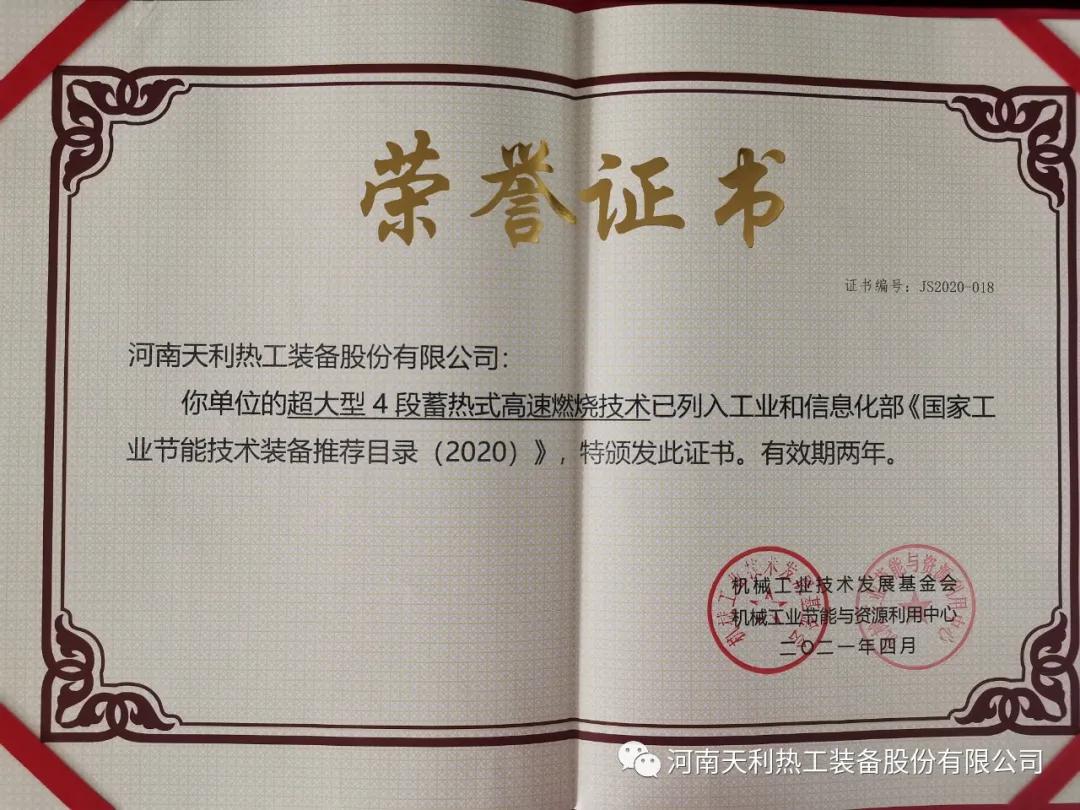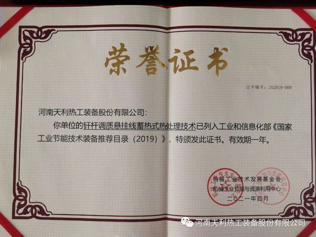 會議發(fā)布了2020年《國家工業(yè)節(jié)能技術裝備推薦目錄》及《“能效之星”產品目錄》入圍企業(yè)名單,并為2019、2020年入圍企業(yè)發(fā)放能效標識及相關證書。天利熱工兩項技術被列入推薦目錄,其中釬桿調質懸掛線蓄熱式熱處理技術被列入《國家工業(yè)節(jié)能技術裝備推薦目錄(2019)》,超大型4段蓄熱式高速燃燒技術被列入《國家工業(yè)節(jié)能技術裝備推薦目錄(2020)》。
