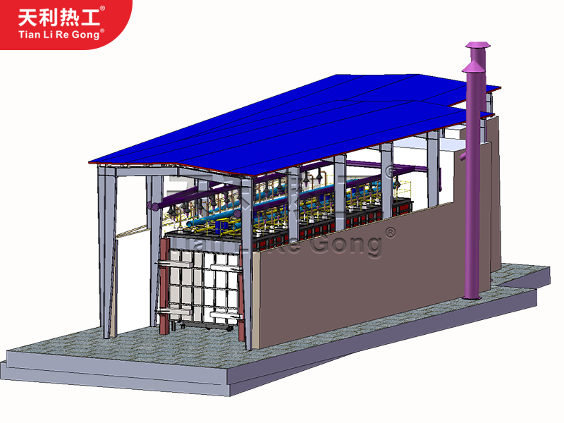 本自身預(yù)熱式燃?xì)鉄崽幚頎t主要由爐體、爐襯、爐門及爐門開啟機構(gòu)、密封裝置、臺車、熱風(fēng)循環(huán)系統(tǒng)、燃燒系統(tǒng)、天燃?xì)夤苈?、空氣管路、排煙管路、密封裝置及電氣及自動控制系統(tǒng)等部分組成。